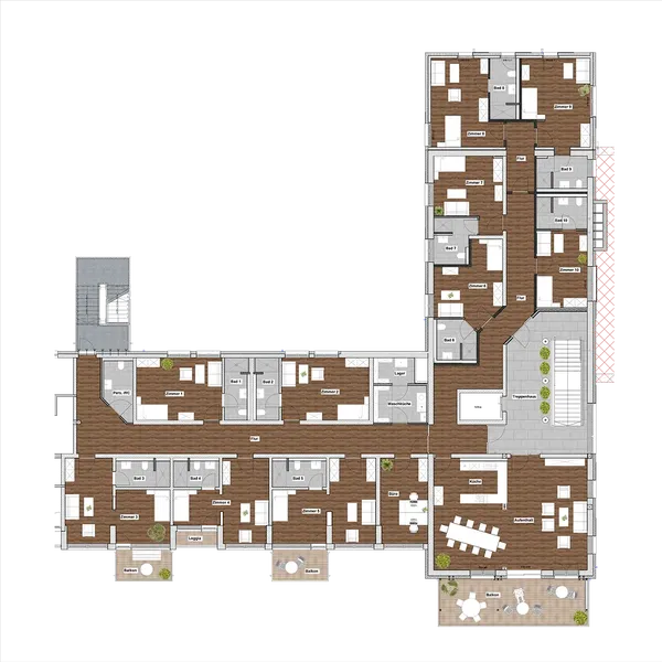Die Wohngemeinschaften 3 und 4 sind selbstverständlich, wie alle unsere Einrichtungen, barrierefrei. Es stehen Zimmer in der Größe von ca. 25 qm bis ca. 33,5 qm bereit. Teilweise mit Balkon oder Loggia. Ein Badezimmer gehört selbstverständlich zu jeder Wohnung. Auch in diesen WGs bildet der Gemeinschaftsraum mit offener Küche das Herzstück. Insgesamt macht das fast 450 qm beste Wohnfläche aus.